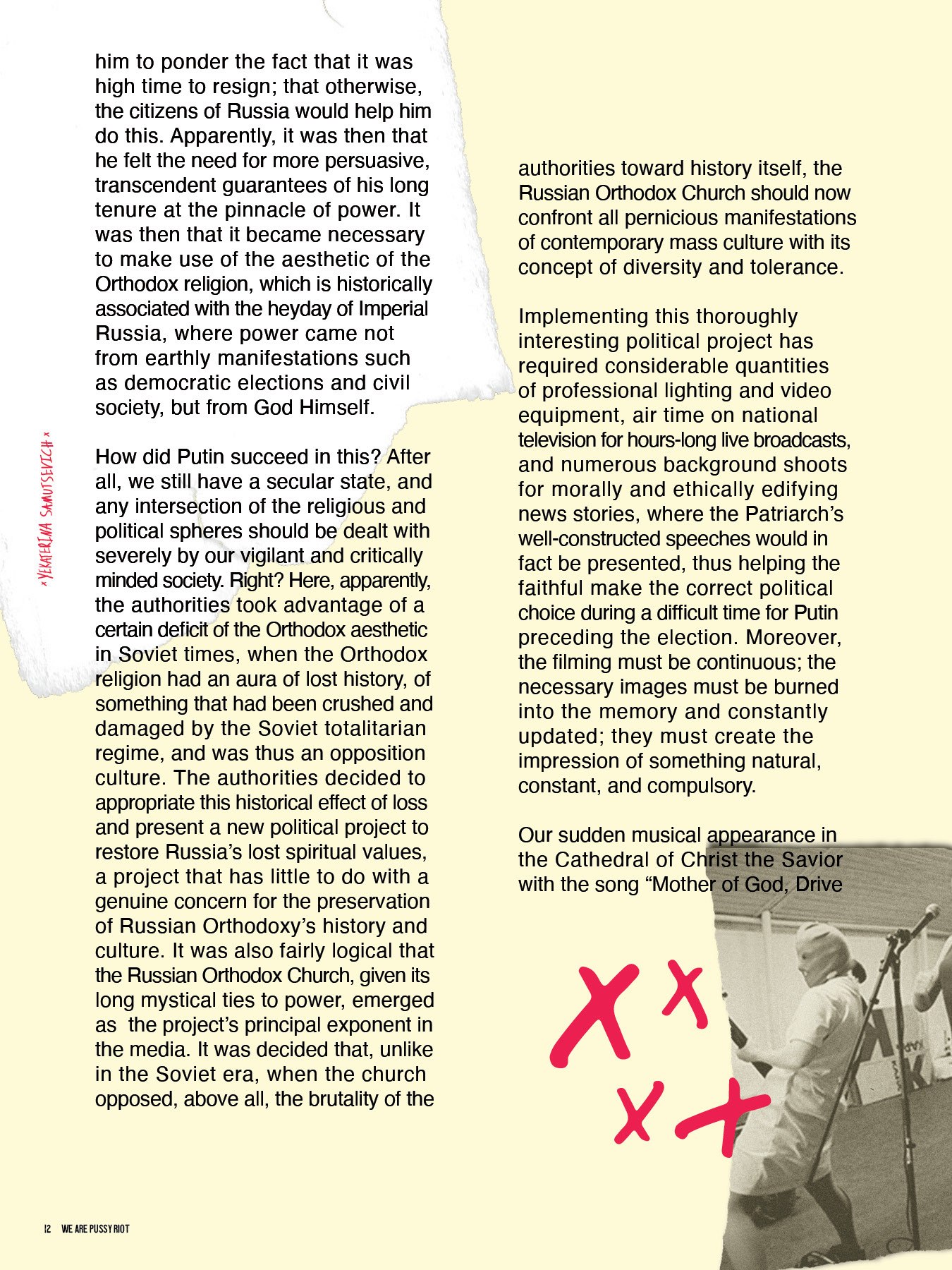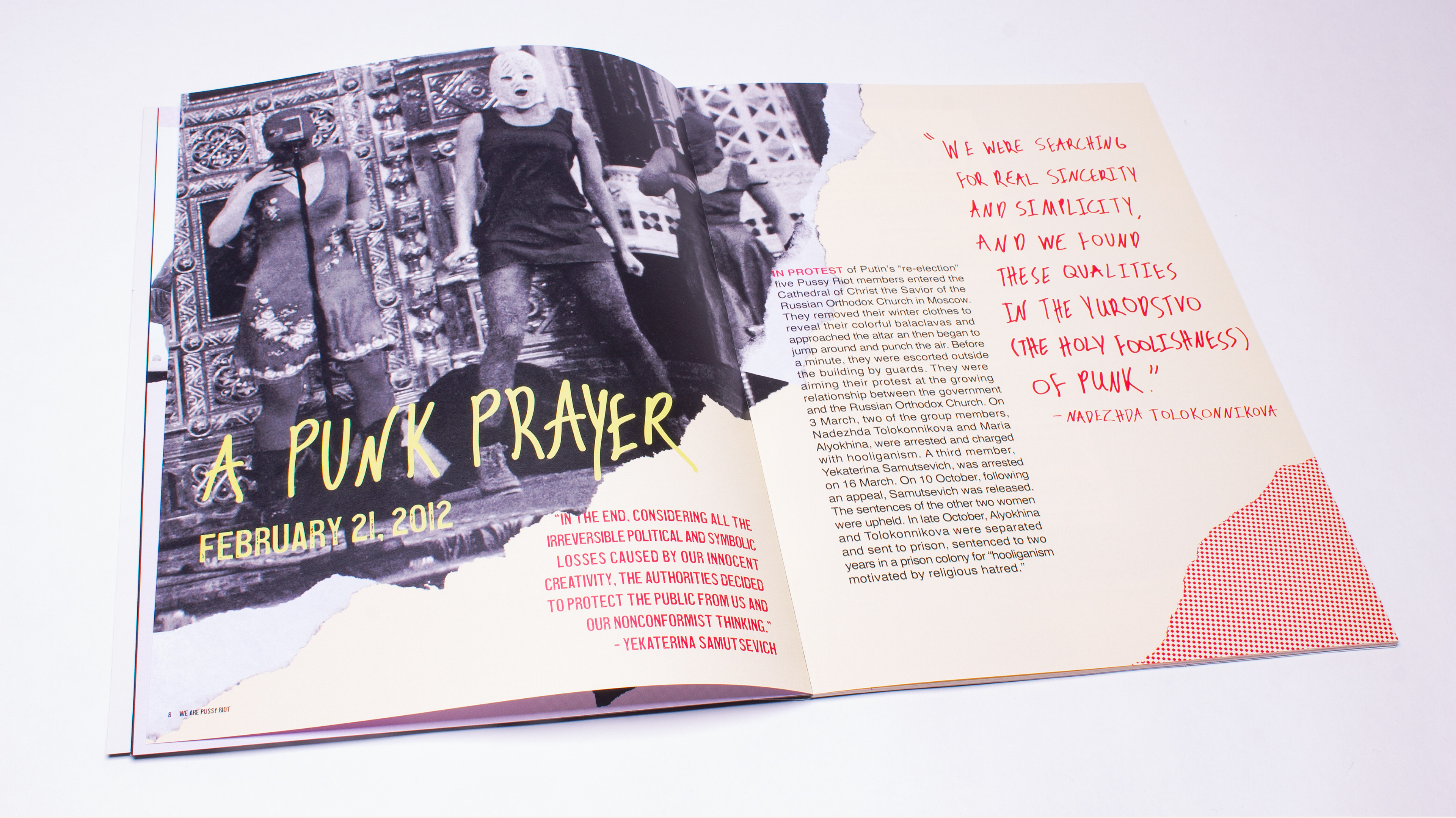 Because the subject matter of this publication is the Russian punk rock activist group Pussy Riot, the design is intended to be loud, textured, and rough, with variations in layout and handwritten and handmade elements. The goal is to keep the reader engaged and involved with varying the combinations of the different visual elements of handwritten text, ripped photos and paper, and textures with the copy. This makes the overall publication feel very real, tangible, and hands on. To view the full publication go to: https://issuu.com/katieharrelson/docs/harrelsonkatherine_pussyriot_porfolioedit02